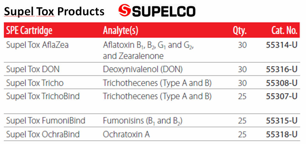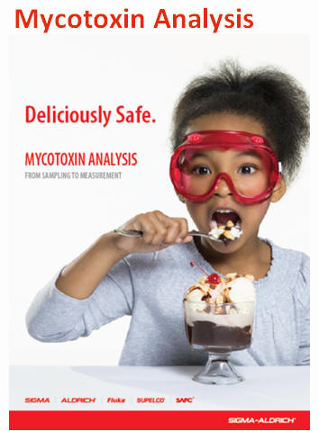黴菌毒素是真菌的二次代謝產物,其生產之二次代謝物含有對人、畜有害的成分。黴菌毒素其英文名中之“myco”是希臘語 mykes(黴菌)之意, “ toxin ” 則為拉丁語 toxicum(毒)之意。食物和飼料在生長、採收、運送以及儲藏過程都可能遭黴菌毒素污染,黴菌毒素的存在可能會影響人類和動物的健康、最常見的黴菌毒素污染源:如黃麴毒素(aflatoxin B1, B2, G1 and G2, aflatoxin M1),赭麴毒素A(OTA),單端孢霉烯族毒素類( Deoxynivalenol –DON, nivalenol, T-2 toxin, HT-2 toxin )和伏馬毒素B1和B2等毒素。 SIMGA 和 MN 兩大知名廠牌提供您 MYCOTOXIN ANALYSIS WORKFLOW 最完整的相關產品,一起為您的食品安全把關。 |