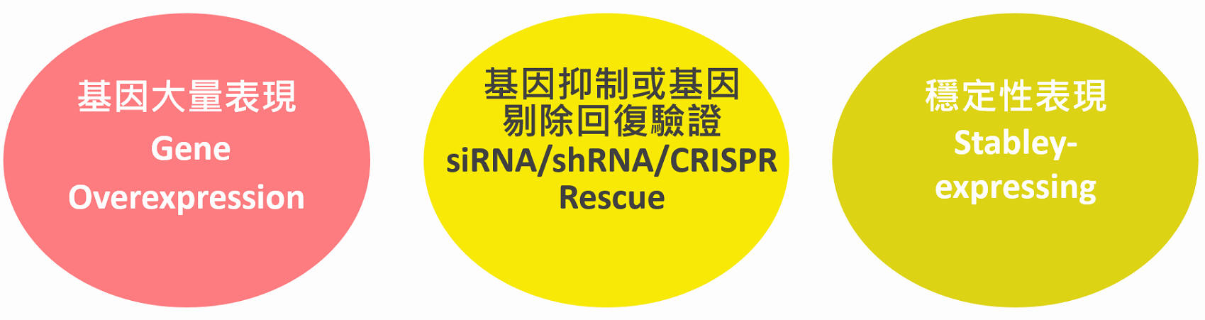 ● RNA 干擾或 CRISPR 實驗經篩選和驗證後作回復驗證。 ● 提供長期、穩定表現且經過富集的細胞。 ● 提供以 lentiviral 為基礎可直接表現的系統。 ● 適合難轉染細胞或是初代細胞。 ● 超過 90% 的克隆經過全面定序。 ● 省時: 省去PCR、克隆和定序等的過程。 |