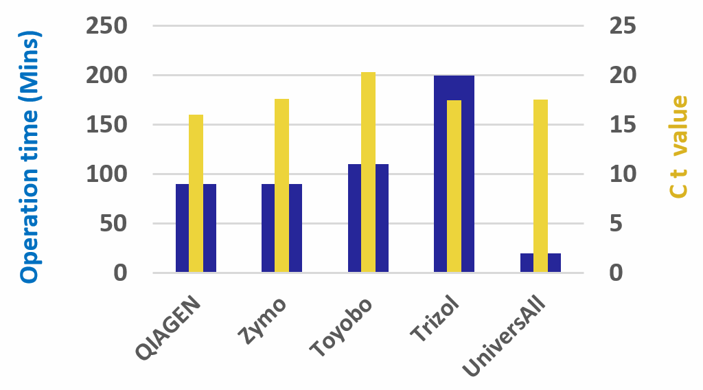 Fig.2 RNA抽取操作時間和 qPCR Ct 值結果比較 (1X106 RAW cells, 20 個樣品) 。 |